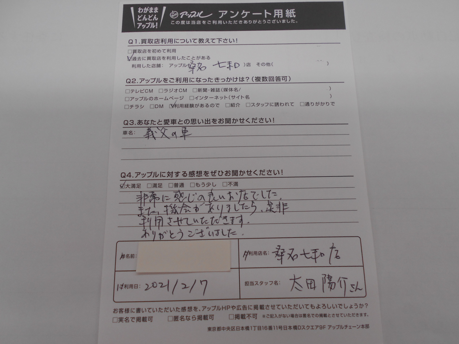 お車のご相談・ 査定だけでもOK! カンタン 入力 30秒 アップルがブランド買取始めました! お電話でも受付中! 受付時間10:00 ~ 19:00 0594-33-2200 お車のご相談・ 査定だけでもOK! カンタン 入力 30秒 アップルがブランド買取始めました! お電話でも受付中! 受付時間10:00 ~ 19:00 0594-33-2200 アップルがブランド買取始めました! お電話でも受付中! 受付時間10:00 ~ 19:00 0594-33-2200 店舗情報 在庫車 スタッフ紹介 ブログ お客様の声 キャンペーン 無料査定 click お客様の声 ご記入日: 2021/02/07 匿名希望様 非常に感じの良いお店でした。また機会がありましたら、是非利用させていただきます。ありがとうございました。 前へ 次へ お客様の声一覧を見る