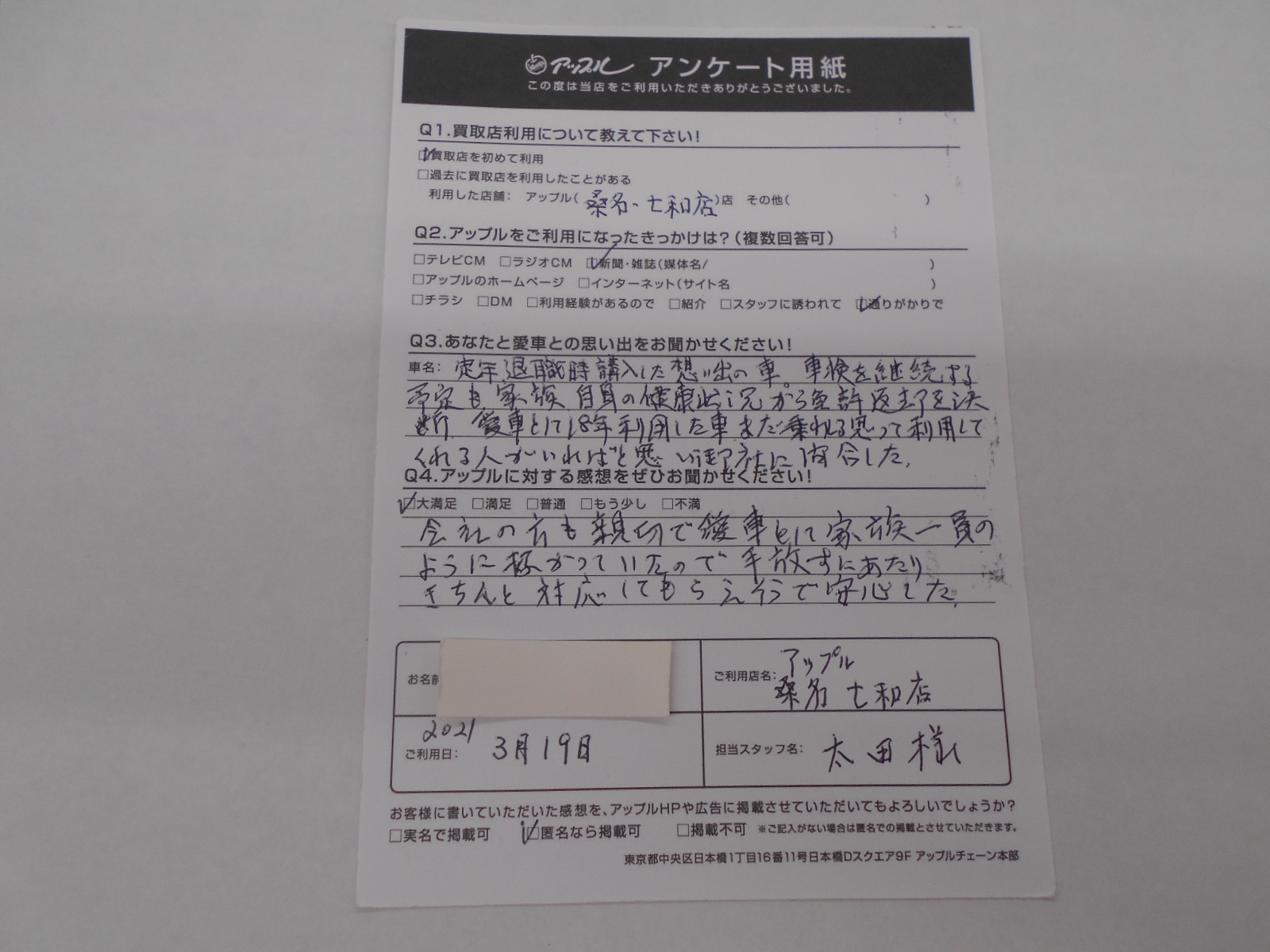 お車のご相談・ 査定だけでもOK! カンタン 入力 30秒 アップルがブランド買取始めました! お電話でも受付中! 受付時間10:00 ~ 19:00 0594-33-2200 お車のご相談・ 査定だけでもOK! カンタン 入力 30秒 アップルがブランド買取始めました! お電話でも受付中! 受付時間10:00 ~ 19:00 0594-33-2200 アップルがブランド買取始めました! お電話でも受付中! 受付時間10:00 ~ 19:00 0594-33-2200 店舗情報 在庫車 スタッフ紹介 ブログ お客様の声 キャンペーン 無料査定 click お客様の声 ご記入日: 2021/03/19 匿名希望アリオン様 会社の方も親切で愛車として家族一員のように扱っていたので手放すにあたりきちんと対応してもらえそうで安心した。 前へ 次へ お客様の声一覧を見る