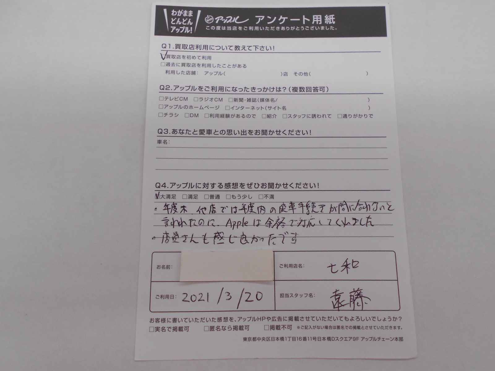 お車のご相談・ 査定だけでもOK! カンタン 入力 30秒 アップルがブランド買取始めました! お電話でも受付中! 受付時間10:00 ~ 19:00 0594-33-2200 お車のご相談・ 査定だけでもOK! カンタン 入力 30秒 アップルがブランド買取始めました! お電話でも受付中! 受付時間10:00 ~ 19:00 0594-33-2200 アップルがブランド買取始めました! お電話でも受付中! 受付時間10:00 ~ 19:00 0594-33-2200 店舗情報 在庫車 スタッフ紹介 ブログ お客様の声 キャンペーン 無料査定 click お客様の声 ご記入日: 2021/03/20 匿名希望AZワゴン様 年度末、他店では年度内の廃車手続きが間に合わないと言われたのに、APPLEは余裕で対応しくれました。店員さんも感じ良かったです。 前へ 次へ お客様の声一覧を見る