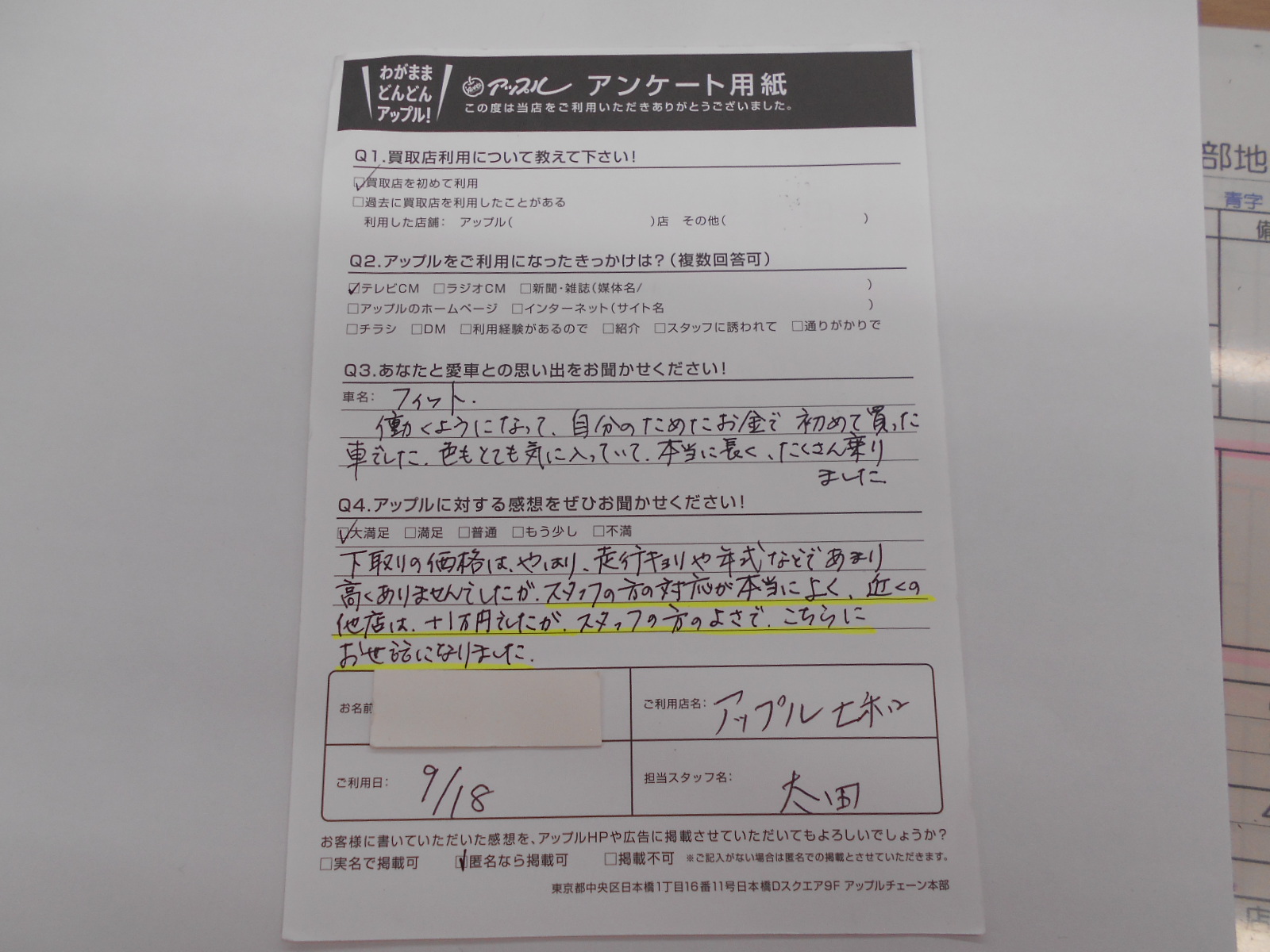 お車のご相談・ 査定だけでもOK! カンタン 入力 30秒 アップルがブランド買取始めました! お電話でも受付中! 受付時間10:00 ~ 19:00 0594-33-2200 お車のご相談・ 査定だけでもOK! カンタン 入力 30秒 アップルがブランド買取始めました! お電話でも受付中! 受付時間10:00 ~ 19:00 0594-33-2200 アップルがブランド買取始めました! お電話でも受付中! 受付時間10:00 ~ 19:00 0594-33-2200 店舗情報 在庫車 スタッフ紹介 ブログ お客様の声 キャンペーン 無料査定 click お客様の声 ご記入日: 2021/09/18 匿名希望フィット様 下取りの価格は、やはり、走行キョリや年式などであまり高くありませんでしたが、スタッフの対応が本当によく、近くの他店は、+1万円でしたが、スタッフの方のよさでこちらにお世話になりました。 前へ 次へ お客様の声一覧を見る