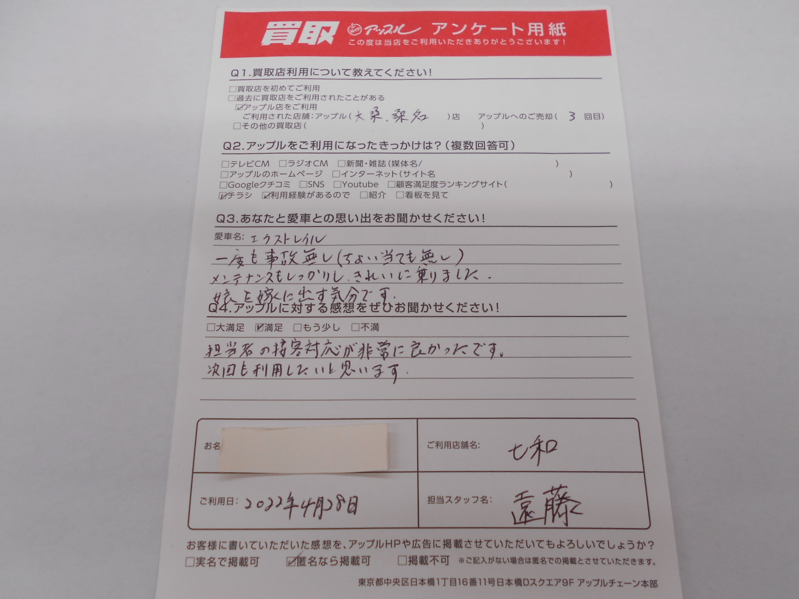 お車のご相談・ 査定だけでもOK! カンタン 入力 30秒 アップルがブランド買取始めました! お電話でも受付中! 受付時間10:00 ~ 19:00 0594-33-2200 お車のご相談・ 査定だけでもOK! カンタン 入力 30秒 アップルがブランド買取始めました! お電話でも受付中! 受付時間10:00 ~ 19:00 0594-33-2200 アップルがブランド買取始めました! お電話でも受付中! 受付時間10:00 ~ 19:00 0594-33-2200 店舗情報 在庫車 スタッフ紹介 ブログ お客様の声 キャンペーン 無料査定 click お客様の声 ご記入日: 2022/04/28 匿名様 車名:日産 エクストレイル 担当者の接客対応が非常に良かったです。次回も利用したいと思います。 前へ 次へ お客様の声一覧を見る