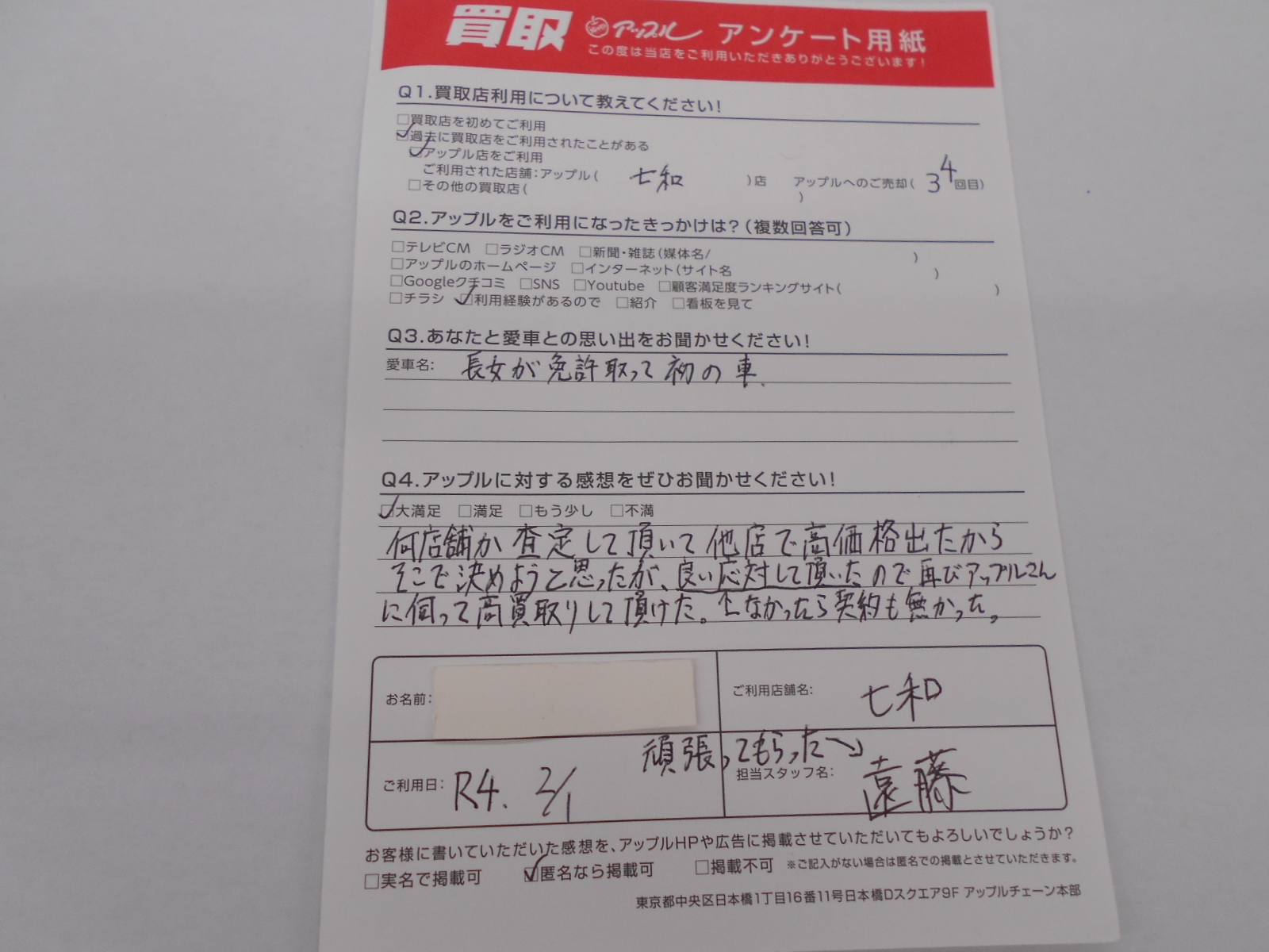 お車のご相談・ 査定だけでもOK! カンタン 入力 30秒 アップルがブランド買取始めました! お電話でも受付中! 受付時間10:00 ~ 19:00 0594-33-2200 お車のご相談・ 査定だけでもOK! カンタン 入力 30秒 アップルがブランド買取始めました! お電話でも受付中! 受付時間10:00 ~ 19:00 0594-33-2200 アップルがブランド買取始めました! お電話でも受付中! 受付時間10:00 ~ 19:00 0594-33-2200 店舗情報 在庫車 スタッフ紹介 ブログ お客様の声 キャンペーン 無料査定 click お客様の声 ご記入日: 2022/02/01 匿名様 車名:日産 デイズ 何店舗か査定して頂いて他店で高価格出てからそこで決めようと思ったが、良い対応して頂いたので再びアップルさんに伺って高買取りして頂けた。↑なかったら契約もなかった。 前へ 次へ お客様の声一覧を見る