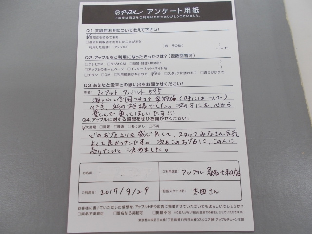 お車のご相談・ 査定だけでもOK! カンタン 入力 30秒 アップルがブランド買取始めました! お電話でも受付中! 受付時間10:00 ~ 19:00 0594-33-2200 お車のご相談・ 査定だけでもOK! カンタン 入力 30秒 アップルがブランド買取始めました! お電話でも受付中! 受付時間10:00 ~ 19:00 0594-33-2200 アップルがブランド買取始めました! お電話でも受付中! 受付時間10:00 ~ 19:00 0594-33-2200 店舗情報 在庫車 スタッフ紹介 ブログ お客様の声 キャンペーン 無料査定 click お客様の声 ご記入日: 2017/09/29 匿名希望 アバルト595様 どの店より感じが良くて、スタッフみなさん元気よくて良かったです。次もこのお店に、この人に売りたいと決めました。 前へ 次へ お客様の声一覧を見る