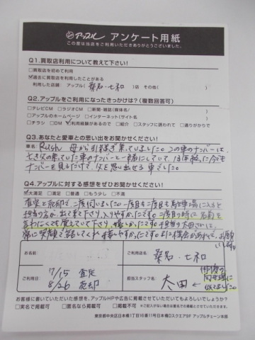 査定と売却で二度伺いました。一度目も二度目も駐車場に入ると担当の方が出てきて下さり入りやすかったです。二度目の時に名前を言わなくても覚えて下さり嬉しかったです。担当の太田さんは常に笑顔で話してくれ接しやすかったです。また機会があればお願い致します。