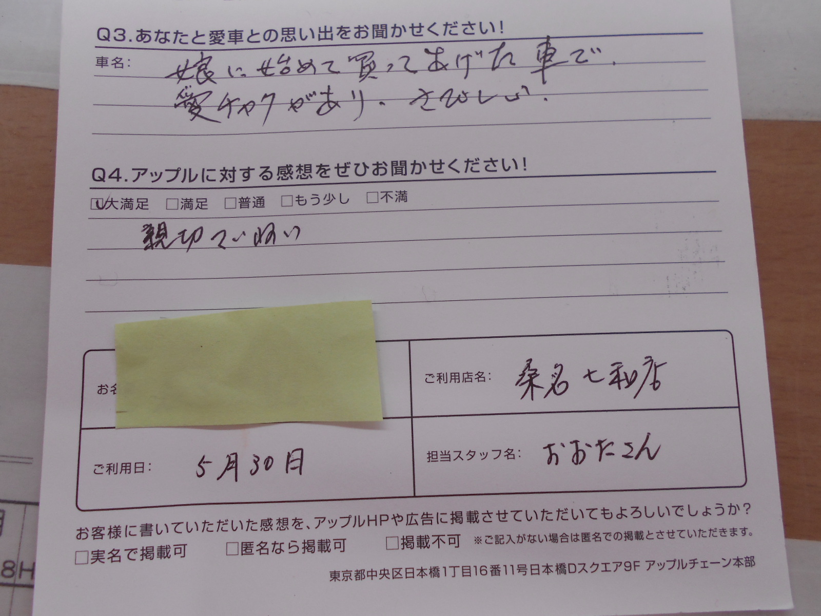 お車のご相談・ 査定だけでもOK! カンタン 入力 30秒 アップルがブランド買取始めました! お電話でも受付中! 受付時間10:00 ~ 19:00 0594-33-2200 お車のご相談・ 査定だけでもOK! カンタン 入力 30秒 アップルがブランド買取始めました! お電話でも受付中! 受付時間10:00 ~ 19:00 0594-33-2200 アップルがブランド買取始めました! お電話でも受付中! 受付時間10:00 ~ 19:00 0594-33-2200 店舗情報 在庫車 スタッフ紹介 ブログ お客様の声 キャンペーン 無料査定 click お客様の声 ご記入日: 2019/05/30 匿名希望ミラ様 車名:ダイハツ ミラ 親切で丁寧 前へ 次へ お客様の声一覧を見る
