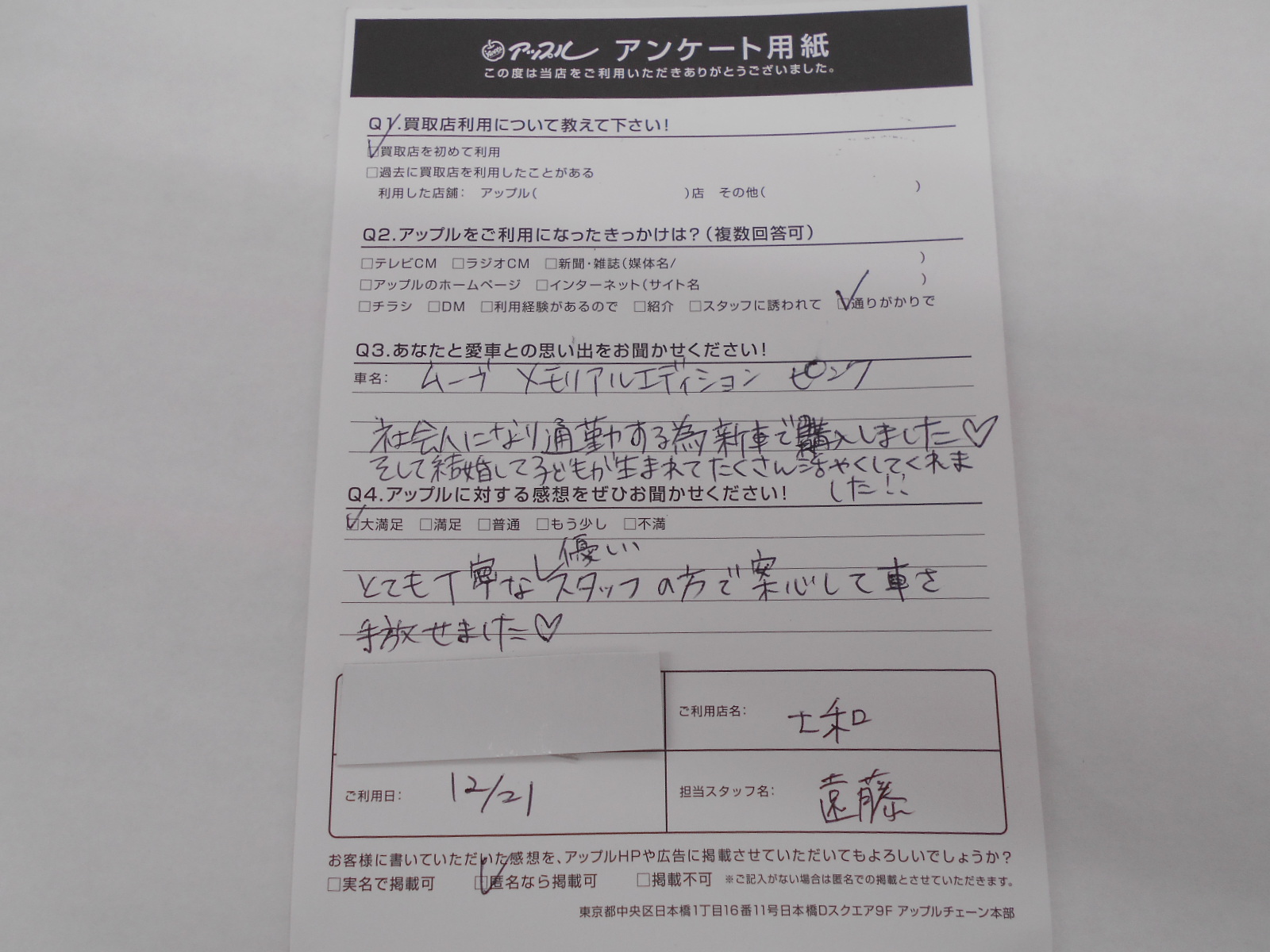 お車のご相談・ 査定だけでもOK! カンタン 入力 30秒 アップルがブランド買取始めました! お電話でも受付中! 受付時間10:00 ~ 19:00 0594-33-2200 お車のご相談・ 査定だけでもOK! カンタン 入力 30秒 アップルがブランド買取始めました! お電話でも受付中! 受付時間10:00 ~ 19:00 0594-33-2200 アップルがブランド買取始めました! お電話でも受付中! 受付時間10:00 ~ 19:00 0594-33-2200 店舗情報 在庫車 スタッフ紹介 ブログ お客様の声 キャンペーン 無料査定 click お客様の声 ご記入日: 2019/12/21 匿名希望ムーヴ様 車名:ダイハツ ムーヴ とても丁寧な優しいスタッフの方で安心して車を手放せました♡ 前へ 次へ お客様の声一覧を見る