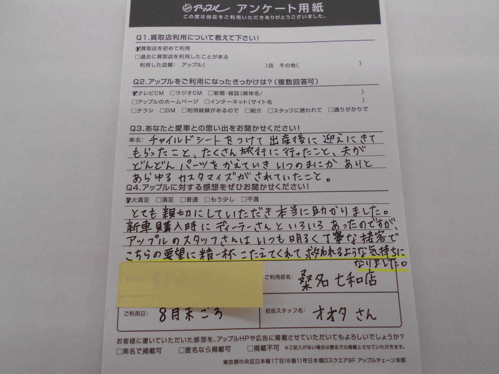 とても親切にしていただき本当に助かりました。新車購入時にディーラーさんといろいろあったのですがアップルのスタッフさんはいつも明るく丁寧な接客でこちらの要望に精一杯こたえてくれて救われるような気持になりました。
