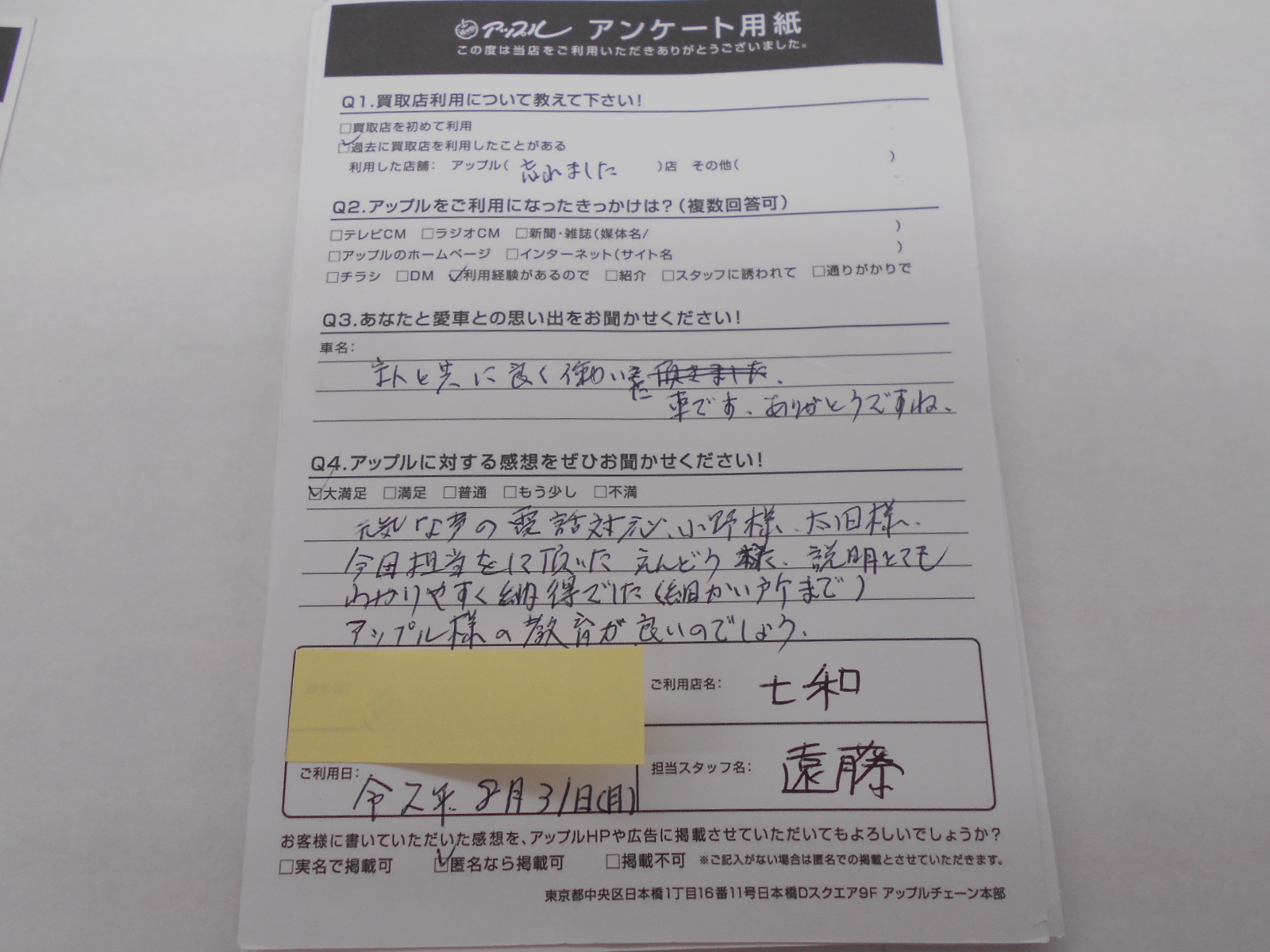 お車のご相談・ 査定だけでもOK! カンタン 入力 30秒 アップルがブランド買取始めました! お電話でも受付中! 受付時間10:00 ~ 19:00 0594-33-2200 お車のご相談・ 査定だけでもOK! カンタン 入力 30秒 アップルがブランド買取始めました! お電話でも受付中! 受付時間10:00 ~ 19:00 0594-33-2200 アップルがブランド買取始めました! お電話でも受付中! 受付時間10:00 ~ 19:00 0594-33-2200 店舗情報 在庫車 スタッフ紹介 ブログ お客様の声 キャンペーン 無料査定 click お客様の声 ご記入日: 2020/08/31 匿名希望様 元気な声の電話対応、小野様、太田様、今日担当をして頂いたえんどう様、説明とてもわかりやすく納得でした。(細かい所まで)アップル様の教育が良いのでしょう。 前へ 次へ お客様の声一覧を見る