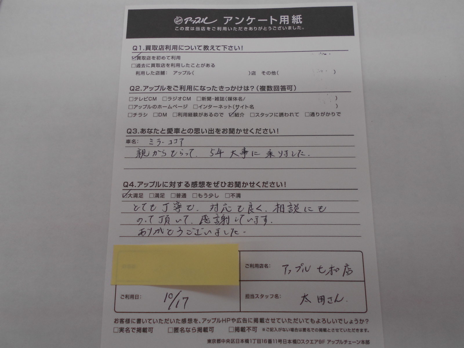 お車のご相談・ 査定だけでもOK! カンタン 入力 30秒 アップルがブランド買取始めました! お電話でも受付中! 受付時間10:00 ~ 19:00 0594-33-2200 お車のご相談・ 査定だけでもOK! カンタン 入力 30秒 アップルがブランド買取始めました! お電話でも受付中! 受付時間10:00 ~ 19:00 0594-33-2200 アップルがブランド買取始めました! お電話でも受付中! 受付時間10:00 ~ 19:00 0594-33-2200 店舗情報 在庫車 スタッフ紹介 ブログ お客様の声 キャンペーン 無料査定 click お客様の声 ご記入日: 2020/10/17 匿名希望ミラココア様 車名:ダイハツ ミラココア とても丁寧で、対応も良く、相談にものって頂いて感謝しています。ありがとうございました。 前へ 次へ お客様の声一覧を見る