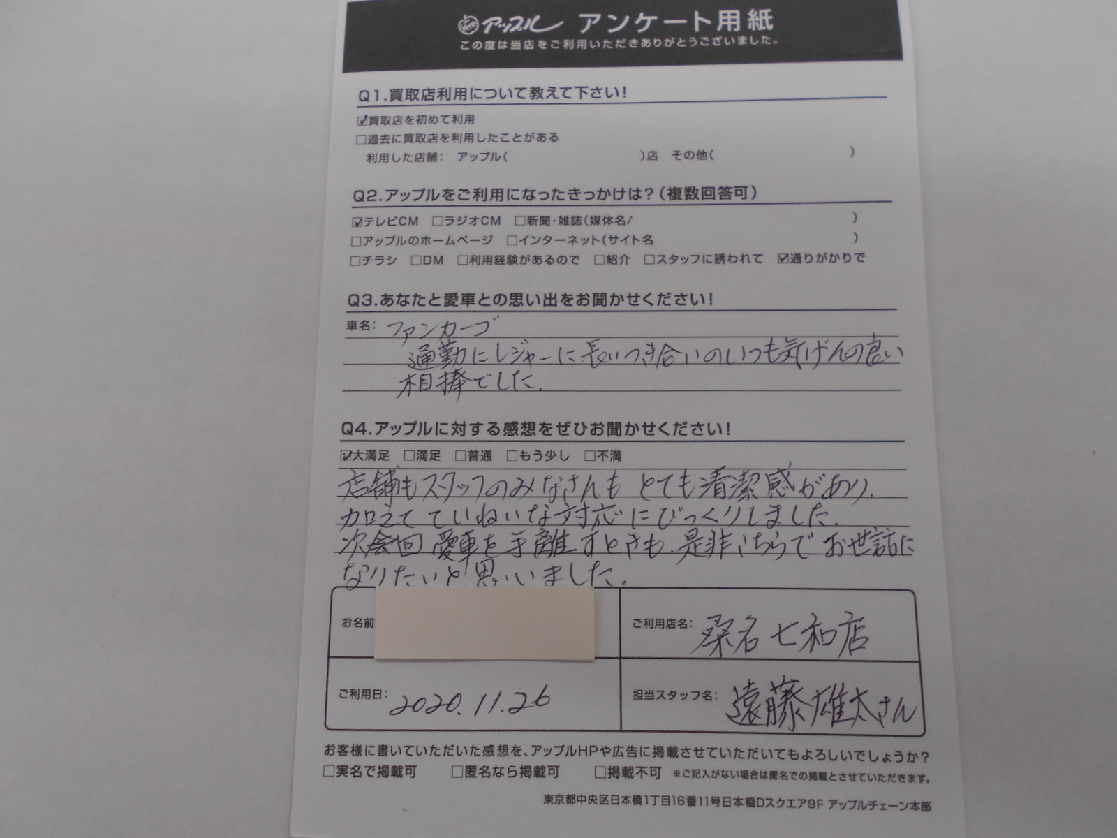 お車のご相談・ 査定だけでもOK! カンタン 入力 30秒 アップルがブランド買取始めました! お電話でも受付中! 受付時間10:00 ~ 19:00 0594-33-2200 お車のご相談・ 査定だけでもOK! カンタン 入力 30秒 アップルがブランド買取始めました! お電話でも受付中! 受付時間10:00 ~ 19:00 0594-33-2200 アップルがブランド買取始めました! お電話でも受付中! 受付時間10:00 ~ 19:00 0594-33-2200 店舗情報 在庫車 スタッフ紹介 ブログ お客様の声 キャンペーン 無料査定 click お客様の声 ご記入日: 2020/11/26 匿名希望ファンカーゴ様 車名:トヨタ ファンカーゴ 店舗もスタッフのみなさんもとても清潔感があり、加えてていねいな対応にビックリしました。次回愛車を手放すときも是非こちらでお世話になりたいと思いました。 前へ 次へ お客様の声一覧を見る