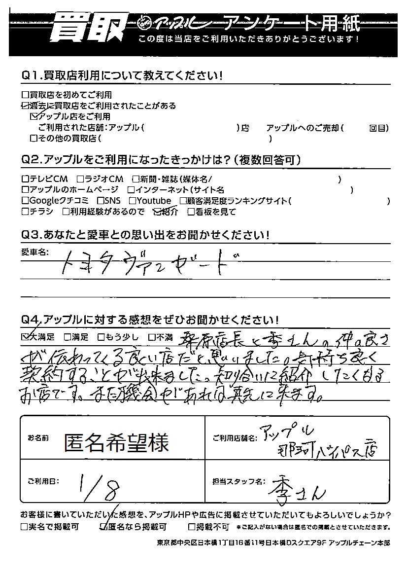 お車のご相談・ 査定だけでもOK! カンタン 入力 30秒 アップルがブランド買取始めました! お電話でも受付中! 受付時間10:00 ~ 18:00 0120-22-2713 お車のご相談・ 査定だけでもOK! カンタン 入力 30秒 アップルがブランド買取始めました! お電話でも受付中! 受付時間10:00 ~ 18:00 0120-22-2713 アップルがブランド買取始めました! お電話でも受付中! 受付時間10:00 ~ 18:00 0120-22-2713 店舗情報 在庫車 スタッフ紹介 ブログ お客様の声 キャンペーン お得 無料査定 click お客様の声 ご記入日: 2022/01/08 匿名希望様 車名:トヨタ ヴァンガード Q アップルに対する感想をぜひお聞かせください!感想:大満足桑原店長と李さんの仲の良さが伝わってくる良い店だと思いました。気持ち良く契約することが出来ました。知り合いに紹介したくなるお店です。また機会があれば真先に来ます。 前へ 次へ お客様の声一覧を見る