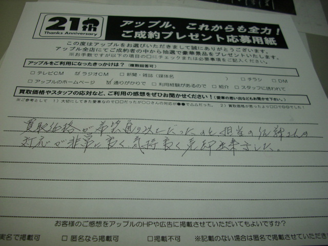 お車のご相談・ 査定だけでもOK! カンタン 入力 30秒 アップルがブランド買取始めました! お電話でも受付中! 受付時間10:00 ~19:00 042-788-4511 お車のご相談・ 査定だけでもOK! カンタン 入力 30秒 アップルがブランド買取始めました! お電話でも受付中! 受付時間10:00 ~19:00 042-788-4511 アップルがブランド買取始めました! お電話でも受付中! 受付時間10:00 ~19:00 042-788-4511 店舗情報 在庫車 スタッフ紹介 ブログ お客様の声 キャンペーン お得 無料査定 click お客様の声 ご記入日: 2010/01/16 上植 太様 買い取り価格が、希望通り以上だったのと 担当の佐藤さんの対応が非常に良く、気持ち良く売却出来ました。 前へ 次へ お客様の声一覧を見る
