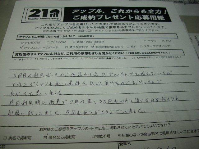 お車のご相談・ 査定だけでもOK! カンタン 入力 30秒 アップルがブランド買取始めました! お電話でも受付中! 受付時間10:00 ~19:00 042-788-4511 お車のご相談・ 査定だけでもOK! カンタン 入力 30秒 アップルがブランド買取始めました! お電話でも受付中! 受付時間10:00 ~19:00 042-788-4511 アップルがブランド買取始めました! お電話でも受付中! 受付時間10:00 ~19:00 042-788-4511 店舗情報 在庫車 スタッフ紹介 ブログ お客様の声 キャンペーン お得 無料査定 click お客様の声 ご記入日: 2010/01/20 T.K様 3回目の利用だったので、他店よりアップルさんでと考えていたがやはり、どこよりも良い条件を出して頂けたので、アップルさんで良かったと思います。前回利用時に他店で、0円の車に 3万円も付けて頂いたのが何よりも印象に残っていました。今回もありがとうございました。 前へ 次へ お客様の声一覧を見る