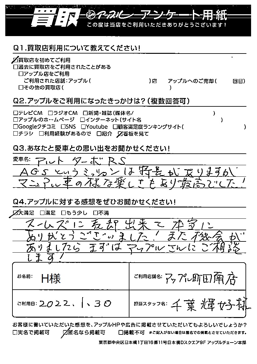 H様 車名:スズキ アルト (2015年12月以降のワークス含む)