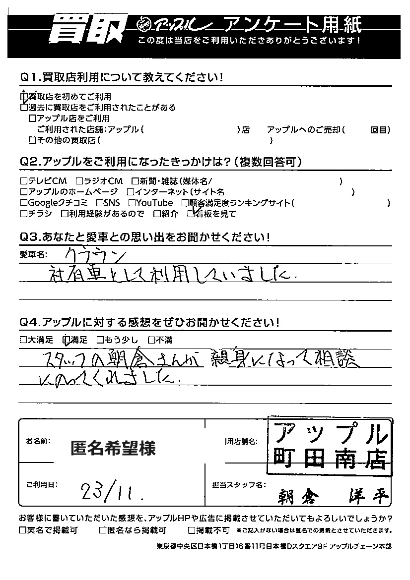 お車のご相談・ 査定だけでもOK! カンタン 入力 30秒 アップルがブランド買取始めました! お電話でも受付中! 受付時間10:00 ~19:00 042-788-4511 お車のご相談・ 査定だけでもOK! カンタン 入力 30秒 アップルがブランド買取始めました! お電話でも受付中! 受付時間10:00 ~19:00 042-788-4511 アップルがブランド買取始めました! お電話でも受付中! 受付時間10:00 ~19:00 042-788-4511 店舗情報 在庫車 スタッフ紹介 ブログ お客様の声 キャンペーン お得 無料査定 click お客様の声 ご記入日: 2024/01/26 匿名希望様 ご利用日:202311月 担当:朝倉 洋平あなたと愛車との思い出をお聞かせください!愛車名:クラウン社有車として利用していました。アップルに対する感想をぜひお聞かせください!スタッフの朝倉さんが親身になって相談にのってくれました。 前へ 次へ お客様の声一覧を見る