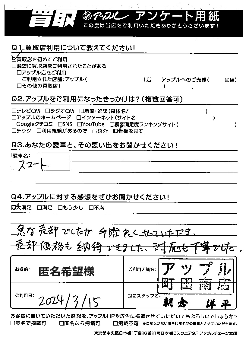 お車のご相談・ 査定だけでもOK! カンタン 入力 30秒 アップルがブランド買取始めました! お電話でも受付中! 受付時間10:00 ~19:00 042-788-4511 お車のご相談・ 査定だけでもOK! カンタン 入力 30秒 アップルがブランド買取始めました! お電話でも受付中! 受付時間10:00 ~19:00 042-788-4511 アップルがブランド買取始めました! お電話でも受付中! 受付時間10:00 ~19:00 042-788-4511 店舗情報 在庫車 スタッフ紹介 ブログ お客様の声 キャンペーン お得 無料査定 click お客様の声 ご記入日: 2024/04/30 匿名希望様 車名:スマート ご利用日:2024年3月15日 担当:朝倉洋平アップルに対する感想をぜひお聞かせください!急な売却でしたが手際よくやっていただき、売却価格も納得できました。対応も丁寧でした。 前へ 次へ お客様の声一覧を見る