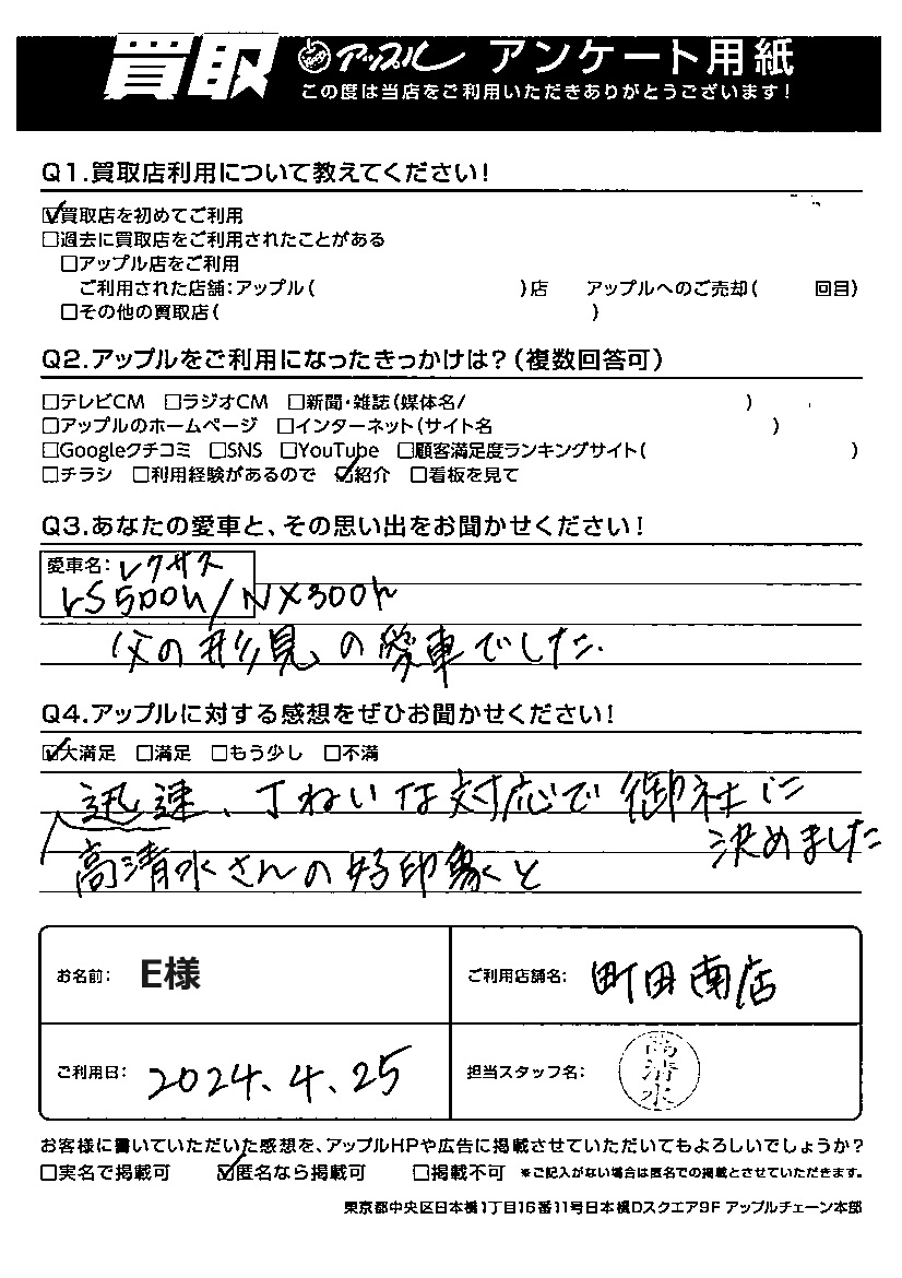 お車のご相談・ 査定だけでもOK! カンタン 入力 30秒 アップルがブランド買取始めました! お電話でも受付中! 受付時間10:00 ~19:00 042-788-4511 お車のご相談・ 査定だけでもOK! カンタン 入力 30秒 アップルがブランド買取始めました! お電話でも受付中! 受付時間10:00 ~19:00 042-788-4511 アップルがブランド買取始めました! お電話でも受付中! 受付時間10:00 ~19:00 042-788-4511 店舗情報 在庫車 スタッフ紹介 ブログ お客様の声 キャンペーン お得 無料査定 click お客様の声 ご記入日: 2024/06/17 E様 車名:レクサス ご利用日:2024年4月25日 担当:高清水あなたの愛車と、その思い出をお聞かせください!レクサス LS500h / NX300h父の形見の愛車でした。アップルに対する感想をぜひお聞かせください!高清水さんの好印象と迅速、ていねいな対応で御社に決めました。 前へ 次へ お客様の声一覧を見る