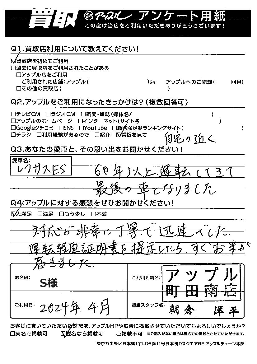 お車のご相談・ 査定だけでもOK! カンタン 入力 30秒 アップルがブランド買取始めました! お電話でも受付中! 受付時間10:00 ~19:00 042-788-4511 お車のご相談・ 査定だけでもOK! カンタン 入力 30秒 アップルがブランド買取始めました! お電話でも受付中! 受付時間10:00 ~19:00 042-788-4511 アップルがブランド買取始めました! お電話でも受付中! 受付時間10:00 ~19:00 042-788-4511 店舗情報 在庫車 スタッフ紹介 ブログ お客様の声 キャンペーン お得 無料査定 click お客様の声 ご記入日: 2024/07/16 S様 車名:レクサス ES ご利用日:2024年4月 担当:朝倉洋平あなたの愛車と、その思い出をお聞かせください!60年以上、運転してきて最後の車となりましたアップルに対する感想をぜひお聞かせください!対応が非常に丁寧で迅速でした。運転経歴証明書を提示したら、すぐお米が届きました。 前へ 次へ お客様の声一覧を見る