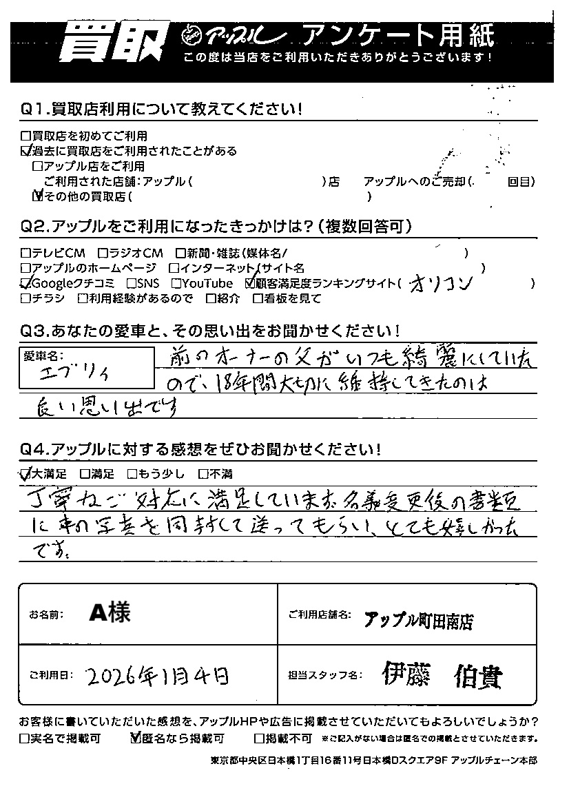A.大満足 丁寧なご対応に満足しています。名義変更後の書類に車の写真を同封して送ってもらい、とても嬉しかった