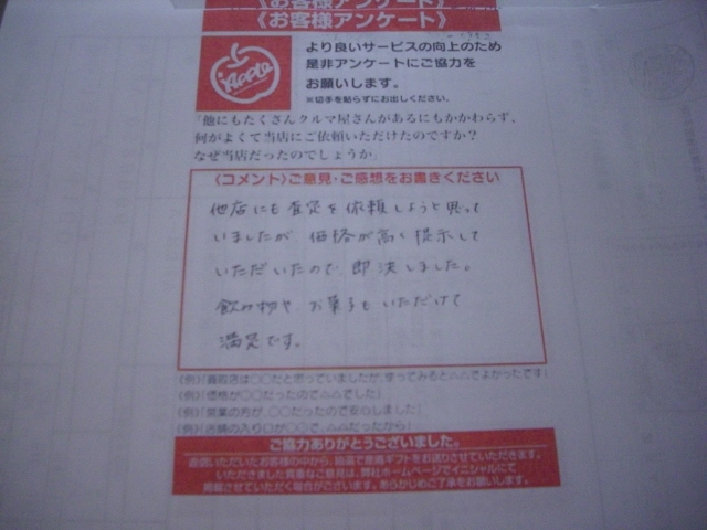 お車のご相談・ 査定だけでもOK! カンタン 入力 30秒 アップルがブランド買取始めました! お電話でも受付中! 受付時間10:00 ~19:00 042-788-4511 お車のご相談・ 査定だけでもOK! カンタン 入力 30秒 アップルがブランド買取始めました! お電話でも受付中! 受付時間10:00 ~19:00 042-788-4511 アップルがブランド買取始めました! お電話でも受付中! 受付時間10:00 ~19:00 042-788-4511 店舗情報 在庫車 スタッフ紹介 ブログ お客様の声 キャンペーン お得 無料査定 click お客様の声 ご記入日: 2011/05/29 S.N様 他店にも査定を依頼しようと思っていましたが価格が高く提示していただけたので、即決しました。飲み物やお菓子もいただけて満足です。 前へ 次へ お客様の声一覧を見る