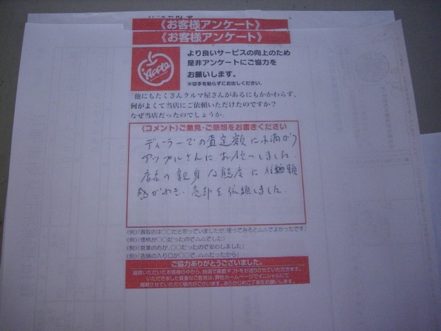 お車のご相談・ 査定だけでもOK! カンタン 入力 30秒 アップルがブランド買取始めました! お電話でも受付中! 受付時間10:00 ~19:00 042-788-4511 お車のご相談・ 査定だけでもOK! カンタン 入力 30秒 アップルがブランド買取始めました! お電話でも受付中! 受付時間10:00 ~19:00 042-788-4511 アップルがブランド買取始めました! お電話でも受付中! 受付時間10:00 ~19:00 042-788-4511 店舗情報 在庫車 スタッフ紹介 ブログ お客様の声 キャンペーン お得 無料査定 click お客様の声 ご記入日: 2011/05/04 T.S様 ディーラーでの査定額に不満がありアップルさんにお願いしました。店長の親身な態度に信頼感がわき売却を依頼しました。 前へ 次へ お客様の声一覧を見る