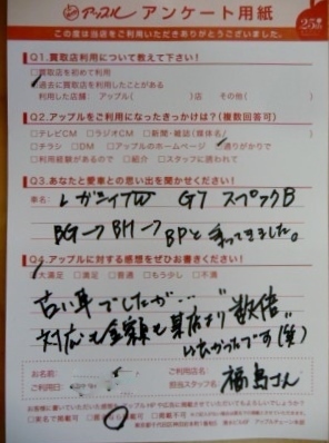 お車のご相談・ 査定だけでもOK! カンタン 入力 30秒 アップルがブランド買取始めました! お電話でも受付中! 受付時間9:30 ~ 18:30 045-430-5123 お車のご相談・ 査定だけでもOK! カンタン 入力 30秒 アップルがブランド買取始めました! お電話でも受付中! 受付時間9:30 ~ 18:30 045-430-5123 アップルがブランド買取始めました! お電話でも受付中! 受付時間9:30 ~ 18:30 045-430-5123 店舗情報 在庫車 スタッフ紹介 ブログ お客様の声 キャンペーン 無料査定 click お客様の声 ご記入日: 2014/08/10 A様 ■ご利用日時■ H26年5月1日■車種■レガシーワゴン■担当者■ 福嶋【アップルに対する感想をぜひお書きください】満足度★★★★★古い車でしたが対応も金額も某店より「数倍」良かったです!(笑) 前へ 次へ お客様の声一覧を見る