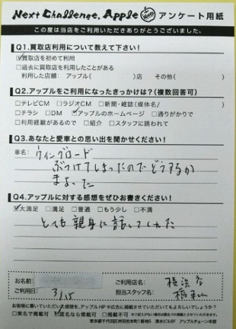 お車のご相談・ 査定だけでもOK! カンタン 入力 30秒 アップルがブランド買取始めました! お電話でも受付中! 受付時間9:30 ~ 18:30 045-430-5123 お車のご相談・ 査定だけでもOK! カンタン 入力 30秒 アップルがブランド買取始めました! お電話でも受付中! 受付時間9:30 ~ 18:30 045-430-5123 アップルがブランド買取始めました! お電話でも受付中! 受付時間9:30 ~ 18:30 045-430-5123 店舗情報 在庫車 スタッフ紹介 ブログ お客様の声 キャンペーン 無料査定 click お客様の声 ご記入日: 2015/03/15 M・K様 ■ご利用日時■ H27年3月15日■車種■ ウイングロード■担当者■ 橋本【アップルに対する感想をぜひお書きください】満足度★★★★★とても親切に話してくれた。 前へ 次へ お客様の声一覧を見る