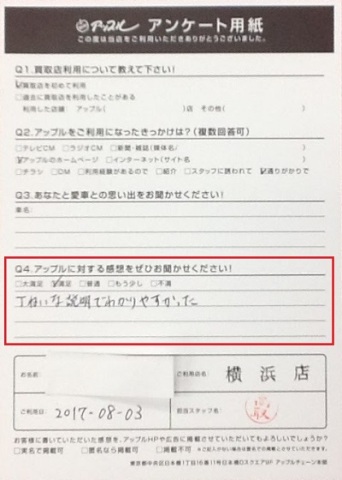 お車のご相談・ 査定だけでもOK! カンタン 入力 30秒 アップルがブランド買取始めました! お電話でも受付中! 受付時間9:30 ~ 18:30 045-430-5123 お車のご相談・ 査定だけでもOK! カンタン 入力 30秒 アップルがブランド買取始めました! お電話でも受付中! 受付時間9:30 ~ 18:30 045-430-5123 アップルがブランド買取始めました! お電話でも受付中! 受付時間9:30 ~ 18:30 045-430-5123 店舗情報 在庫車 スタッフ紹介 ブログ お客様の声 キャンペーン 無料査定 click お客様の声 ご記入日: 2017/08/03 S・Y様 ■ご利用日時■ H 29 年 8 月 3 日■車種■ MAX■担当者■ 高取《アップルに対する感想をぜひお書きください》 満足度★★★★丁寧な説明でわかりやすかった。 前へ 次へ お客様の声一覧を見る