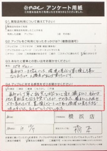 最初から丁寧で、誠実な対応をして頂き(橋本さん)、当初は他の買取店も回る予定でしたが、やめました。橋本さんにお任せできて良かったです。買い換えディーラーの下取り価格との差も大きな決め手でした。ありがとうございました。