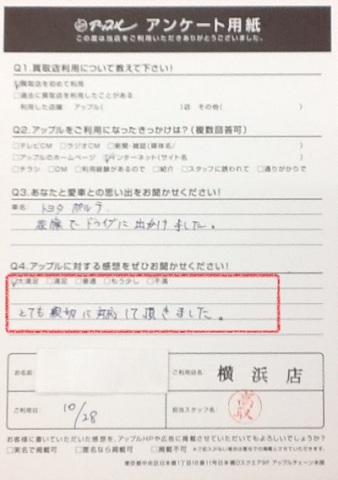 お車のご相談・ 査定だけでもOK! カンタン 入力 30秒 アップルがブランド買取始めました! お電話でも受付中! 受付時間9:30 ~ 18:30 045-430-5123 お車のご相談・ 査定だけでもOK! カンタン 入力 30秒 アップルがブランド買取始めました! お電話でも受付中! 受付時間9:30 ~ 18:30 045-430-5123 アップルがブランド買取始めました! お電話でも受付中! 受付時間9:30 ~ 18:30 045-430-5123 店舗情報 在庫車 スタッフ紹介 ブログ お客様の声 キャンペーン 無料査定 click お客様の声 ご記入日: 2017/10/28 K・T様 ■ご利用日時■ H 29 年 10 月 28 日■車種■ ポルテ■担当者■ 高取《アップルに対する感想をぜひお書きください》満足度★★★★★とても親切に対応して頂きました。 前へ 次へ お客様の声一覧を見る