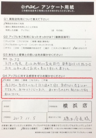 売る側の気持ちになって話を進めて頂き、気持ちよく売ることができました。ありがとうございました。車の中の忘れ物を取っておいて頂き助かりました。