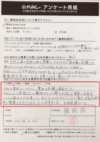 それ以上に高取さんの電話口での丁寧な対応と、愛車を手放すことへの私の小さな迷いにあたたかなアドバイスを頂き、大変気持ち良く愛車とサヨナラすることが出来ました。お世話様でした。