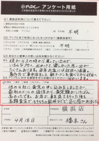他の4社に査定の申し込みをしましたが、最初のメールの返信から査定額がいちばん高かったです。お店で車を見てもらった後も高額査定で、諸々の説明などで安心感がありました。