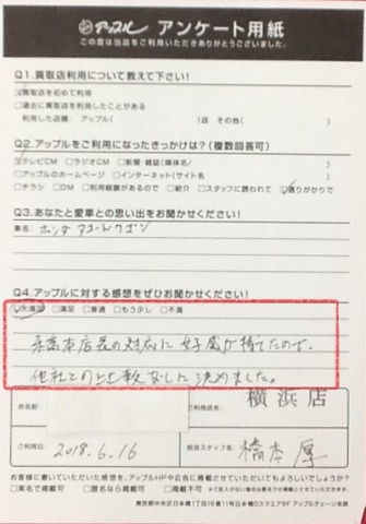 橋本店長の対応に好感が持てたので、他社との比較なしに決めました。
