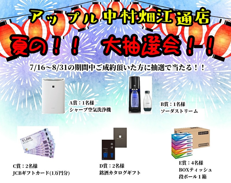 お車のご相談・ 査定だけでもOK! カンタン 入力 30秒 アップルがブランド買取始めました! お電話でも受付中! 受付時間10:00 ~ 19:00 052-483-1181 お車のご相談・ 査定だけでもOK! カンタン 入力 30秒 アップルがブランド買取始めました! お電話でも受付中! 受付時間10:00 ~ 19:00 052-483-1181 アップルがブランド買取始めました! お電話でも受付中! 受付時間10:00 ~ 19:00 052-483-1181 店舗情報 在庫車 スタッフ紹介 ブログ お客様の声 キャンペーン 無料査定 click [ 未分類 ] 2024/07/16 (火) 15:10 中村畑江通店限定!キャンペーン! ブログをご覧の皆様、こんにちは!!雨は今日まで?週間天気予報から傘マークはなくなってますね!!いよいよ夏本番でしょうか!楽しみですね~(*´ω`*)さて!!本日より!!キャンペーンがスタートします!!アップル中村畑江通店限定の大抽選会!!7/16~8/31の期間中にご成約頂いた方の中から抽選で豪華景品をプレゼント!!合計10名様に当たります!!もしも…もしも抽選に外れてしまっても当たるかも?是非この機会にアップル中村畑江通店にお越しください!!スタッフ一同ご来店を心よりお待ちしておりますー(*´▽`*)名古屋市中村区の車買取専門店アップル中村畑江通店℡:052-483-1181 2024-07-16 15:10:45 新しい記事へ 古い記事へ 最新記事 GW休業のお知らせ頂きもの臨時休業のお知らせ筍食事バル shitu 店舗情報に戻る 月別アーカイブ 2026年04月(9)2026年03月(5)2026年02月(10)2026年01月(11)2025年12月(11)2025年11月(13)2025年10月(9)2025年09月(12)2025年08月(9)2025年07月(10)2025年06月(12)2025年05月(7)2025年04月(12)2025年03月(10)2025年02月(11)2025年01月(6)2024年12月(13)2024年11月(14)2024年10月(9)2024年09月(11)2024年08月(10)2024年07月(9)2024年06月(11)2024年05月(11)2024年04月(16)2024年03月(9)2024年02月(10)2024年01月(15)2023年12月(17)2023年11月(18)2023年10月(14)2023年09月(20)2023年08月(21)2023年07月(27)2023年06月(26)2023年05月(22)2023年04月(25)2023年03月(24)2023年02月(23)2023年01月(24)2022年12月(24)2022年11月(25)2022年10月(27)2022年09月(26)2022年08月(21)2022年07月(27)2022年06月(25)2022年05月(22)2022年04月(26)2022年03月(26)2022年02月(24)2022年01月(24)2021年12月(21)2021年11月(26)2021年10月(27)2021年09月(20)2021年08月(13)2021年07月(17)2021年06月(20)2021年05月(12)2021年04月(12)2021年03月(8)2021年02月(8)2021年01月(7)2020年12月(8)2020年11月(8)2020年10月(10)2020年09月(11)2020年08月(10)2020年07月(10)2020年06月(17)2020年05月(11)2020年04月(13)2020年03月(10)2020年02月(13)2020年01月(11)2019年12月(12)2019年11月(8)2019年10月(8)2019年09月(8)2019年08月(10)2019年07月(6)2019年06月(8)2019年05月(11)2019年04月(9)2019年03月(3)2019年02月(6)2019年01月(1)2018年12月(5)2018年11月(7)2018年10月(10)2018年09月(13)2018年08月(17)2018年07月(14)2018年06月(11)2018年05月(10)2018年04月(13)2018年03月(10)2018年02月(9)2018年01月(11)2017年12月(8)2017年11月(9)2017年10月(8)2017年09月(8)2017年08月(6)2017年07月(8)2017年06月(9)2017年05月(6)2017年04月(9)2017年03月(6)2017年02月(6)2017年01月(10)2016年12月(9)2016年11月(9)2016年10月(9)2016年09月(8)2016年08月(9)2016年07月(7)2016年06月(2)2016年05月(3)2016年04月(3)2016年02月(1)2016年01月(4)2015年12月(5)2015年11月(3)2015年10月(3)2015年09月(4)2015年08月(6)2015年07月(4)2015年06月(5)2015年05月(4)2015年04月(2)2015年03月(4)2015年02月(2)2015年01月(4)2014年12月(6)2014年11月(4)2014年10月(4)2014年09月(7)2014年08月(10)2014年07月(6)2014年06月(8)2014年05月(10)2014年04月(6)2014年02月(1)2014年01月(1)2013年12月(3)2013年10月(2)2013年09月(1)