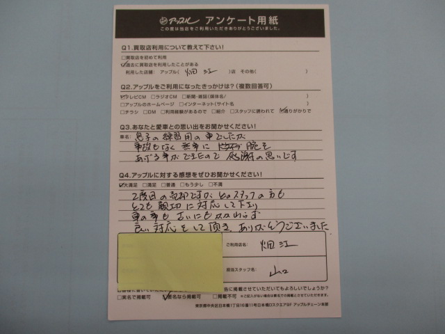 お車のご相談・ 査定だけでもOK! カンタン 入力 30秒 アップルがブランド買取始めました! お電話でも受付中! 受付時間10:00 ~ 19:00 052-483-1181 お車のご相談・ 査定だけでもOK! カンタン 入力 30秒 アップルがブランド買取始めました! お電話でも受付中! 受付時間10:00 ~ 19:00 052-483-1181 アップルがブランド買取始めました! お電話でも受付中! 受付時間10:00 ~ 19:00 052-483-1181 店舗情報 在庫車 スタッフ紹介 ブログ お客様の声 キャンペーン 無料査定 click お客様の声 ご記入日: 2021/02/02 K(女性)様 2度目の売却ですが、どのスタッフの方もとても親切に対応して下さり車の事も古いにもかかわらず良い対応をして頂き、ありがとうございました。 前へ 次へ お客様の声一覧を見る