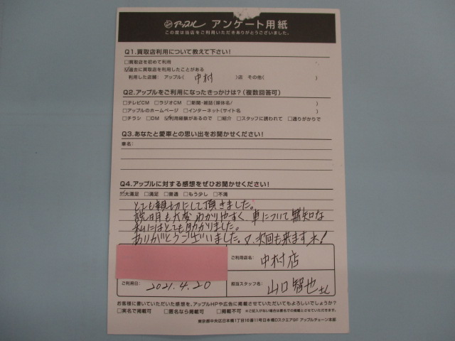 お車のご相談・ 査定だけでもOK! カンタン 入力 30秒 アップルがブランド買取始めました! お電話でも受付中! 受付時間10:00 ~ 19:00 052-483-1181 お車のご相談・ 査定だけでもOK! カンタン 入力 30秒 アップルがブランド買取始めました! お電話でも受付中! 受付時間10:00 ~ 19:00 052-483-1181 アップルがブランド買取始めました! お電話でも受付中! 受付時間10:00 ~ 19:00 052-483-1181 店舗情報 在庫車 スタッフ紹介 ブログ お客様の声 キャンペーン 無料査定 click お客様の声 ご記入日: 2021/04/20 T(女性)様 とても親切にして頂きました。説明も大変わかりやすく、車について無知な私にはとても助かりました。ありがとうございました。又、次回も来ますネ! 前へ 次へ お客様の声一覧を見る