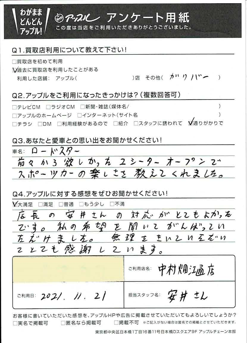 お車のご相談・ 査定だけでもOK! カンタン 入力 30秒 アップルがブランド買取始めました! お電話でも受付中! 受付時間10:00 ~ 19:00 052-483-1181 お車のご相談・ 査定だけでもOK! カンタン 入力 30秒 アップルがブランド買取始めました! お電話でも受付中! 受付時間10:00 ~ 19:00 052-483-1181 アップルがブランド買取始めました! お電話でも受付中! 受付時間10:00 ~ 19:00 052-483-1181 店舗情報 在庫車 スタッフ紹介 ブログ お客様の声 キャンペーン 無料査定 click お客様の声 ご記入日: 2021/11/21 名古屋市 A(男性)様 車名:マツダ ロードスター 店長の安井さんの対応がとてもよかったです。私の希望を聞いてがんばっていただけました。無理をきいていただいてとても感謝しています。 前へ 次へ お客様の声一覧を見る
