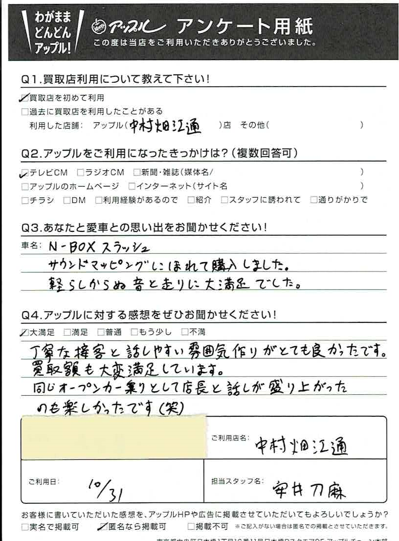 お車のご相談・ 査定だけでもOK! カンタン 入力 30秒 アップルがブランド買取始めました! お電話でも受付中! 受付時間10:00 ~ 19:00 052-483-1181 お車のご相談・ 査定だけでもOK! カンタン 入力 30秒 アップルがブランド買取始めました! お電話でも受付中! 受付時間10:00 ~ 19:00 052-483-1181 アップルがブランド買取始めました! お電話でも受付中! 受付時間10:00 ~ 19:00 052-483-1181 店舗情報 在庫車 スタッフ紹介 ブログ お客様の声 キャンペーン 無料査定 click お客様の声 ご記入日: 2021/10/31 名古屋市 I(男性)様 車名:ホンダ N-BOXスラッシュ 丁寧な接客と話しやすい雰囲気作りがとても良かったです。買取額も大変満足しています。同じオープンカー乗りとして店長と話が盛り上がったのも楽しかったです(笑) 前へ 次へ お客様の声一覧を見る