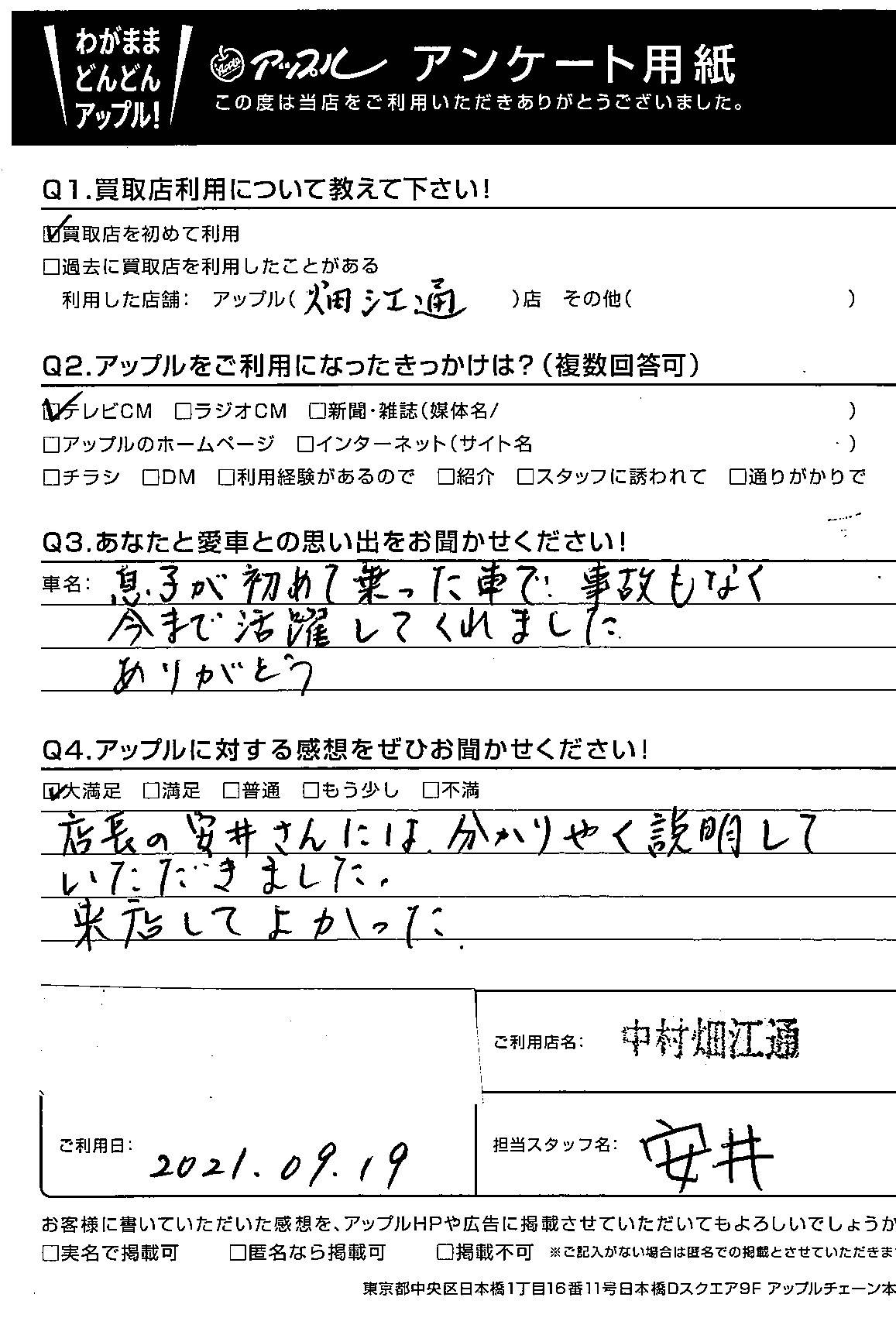 お車のご相談・ 査定だけでもOK! カンタン 入力 30秒 アップルがブランド買取始めました! お電話でも受付中! 受付時間10:00 ~ 19:00 052-483-1181 お車のご相談・ 査定だけでもOK! カンタン 入力 30秒 アップルがブランド買取始めました! お電話でも受付中! 受付時間10:00 ~ 19:00 052-483-1181 アップルがブランド買取始めました! お電話でも受付中! 受付時間10:00 ~ 19:00 052-483-1181 店舗情報 在庫車 スタッフ紹介 ブログ お客様の声 キャンペーン 無料査定 click お客様の声 ご記入日: 2021/09/19 名古屋市 G(女性)様 車名:ダイハツ ムーヴ 店長の安井さんには分かりやすく説明していただきました。来店してよかった 前へ 次へ お客様の声一覧を見る