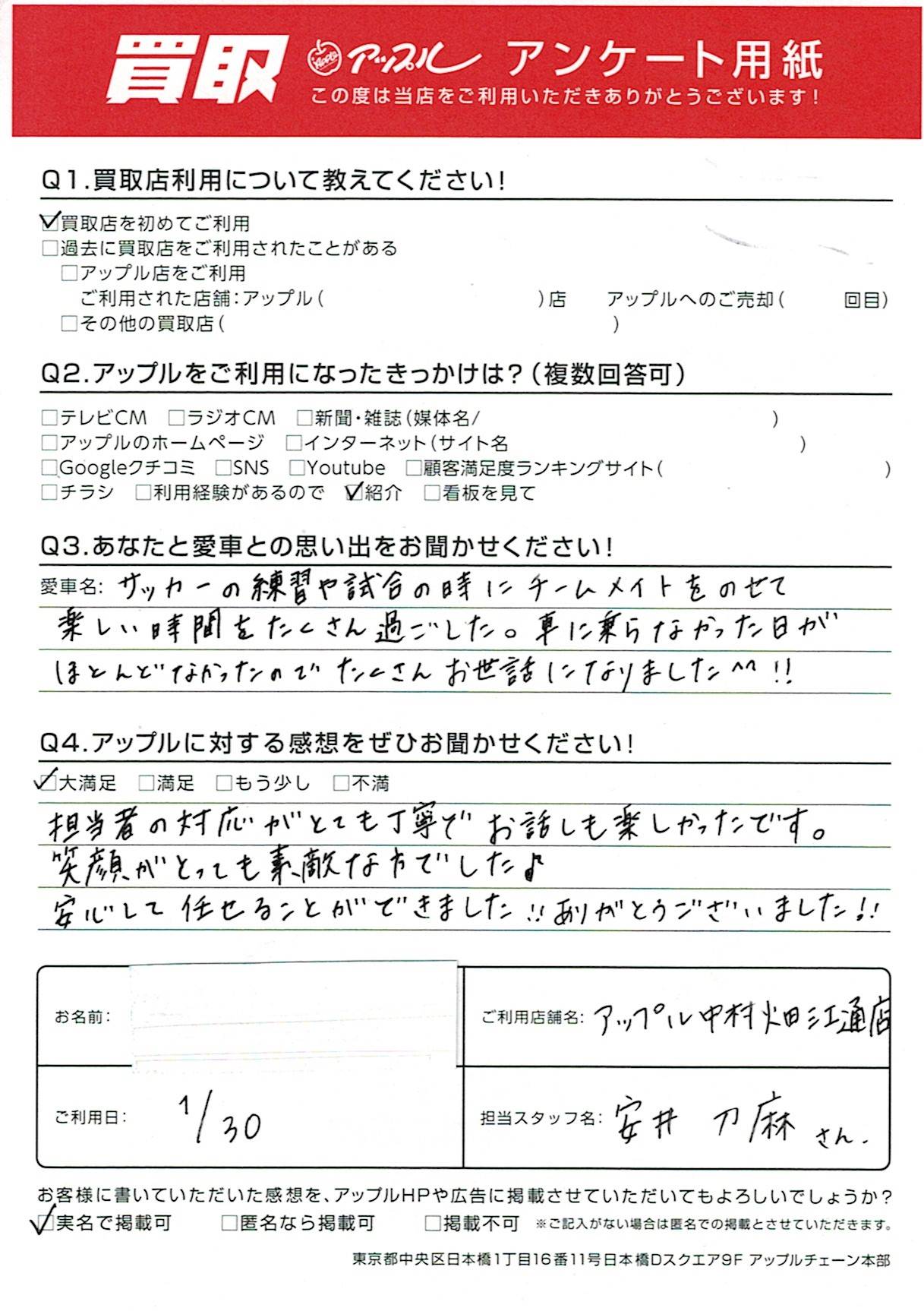 お車のご相談・ 査定だけでもOK! カンタン 入力 30秒 アップルがブランド買取始めました! お電話でも受付中! 受付時間10:00 ~ 19:00 052-483-1181 お車のご相談・ 査定だけでもOK! カンタン 入力 30秒 アップルがブランド買取始めました! お電話でも受付中! 受付時間10:00 ~ 19:00 052-483-1181 アップルがブランド買取始めました! お電話でも受付中! 受付時間10:00 ~ 19:00 052-483-1181 店舗情報 在庫車 スタッフ紹介 ブログ お客様の声 キャンペーン 無料査定 click お客様の声 ご記入日: 2022/01/30 名古屋市 M(女性)様 車名:三菱 eKワゴン 担当者の対応がとても丁寧でお話しも楽しかったです。笑顔がとっても素敵な方でした♪安心して任せることができました!!ありがとうございました!! 前へ 次へ お客様の声一覧を見る