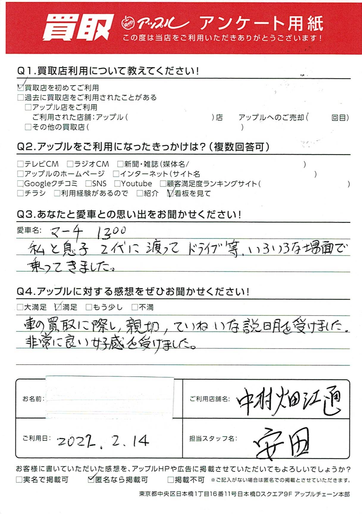 お車のご相談・ 査定だけでもOK! カンタン 入力 30秒 アップルがブランド買取始めました! お電話でも受付中! 受付時間10:00 ~ 19:00 052-483-1181 お車のご相談・ 査定だけでもOK! カンタン 入力 30秒 アップルがブランド買取始めました! お電話でも受付中! 受付時間10:00 ~ 19:00 052-483-1181 アップルがブランド買取始めました! お電話でも受付中! 受付時間10:00 ~ 19:00 052-483-1181 店舗情報 在庫車 スタッフ紹介 ブログ お客様の声 キャンペーン 無料査定 click お客様の声 ご記入日: 2022/02/14 名古屋市 N様(男性)様 車名:日産 マーチ 車の買取に際し、親切、ていねいな説明を受けました。非常に良い交換を受けました。 前へ 次へ お客様の声一覧を見る