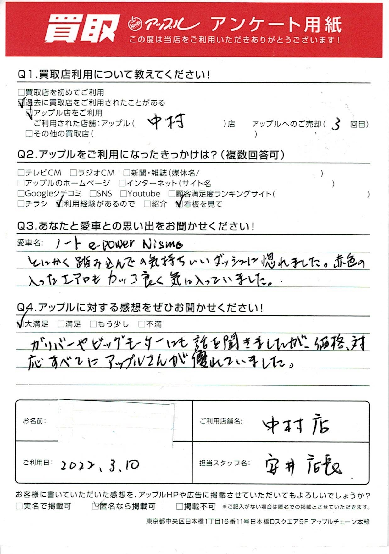 お車のご相談・ 査定だけでもOK! カンタン 入力 30秒 アップルがブランド買取始めました! お電話でも受付中! 受付時間10:00 ~ 19:00 052-483-1181 お車のご相談・ 査定だけでもOK! カンタン 入力 30秒 アップルがブランド買取始めました! お電話でも受付中! 受付時間10:00 ~ 19:00 052-483-1181 アップルがブランド買取始めました! お電話でも受付中! 受付時間10:00 ~ 19:00 052-483-1181 店舗情報 在庫車 スタッフ紹介 ブログ お客様の声 キャンペーン 無料査定 click お客様の声 ご記入日: 2022/03/10 名古屋市 D様(男性)様 車名:日産 ノート ガリバーやビッグモーターにも話を聞きましたが、価格、対応すべてにおいてアップルさんが優れていました。 前へ 次へ お客様の声一覧を見る