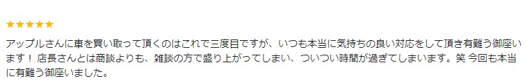 アップルさんに車を買い取って頂くのはこれで三度目ですが、いつも本当に気持ちの良い対応をして頂き有難う御座います!