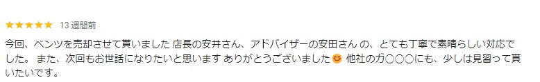 今回、ベンツを売却させて貰いました 店長の安井さん、アドバイザーの安田さん の、とても丁寧で素晴らしい対応でした。 また、次回もお世話になりたいと思います ありがとうございました😊 他社のガ◯◯◯にも、少しは見習って貰いたいです。
