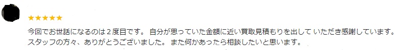 今回でお世話になるのは2度目です。自分が思っていた金額に近い買取見積もりを出していただき感謝いています。