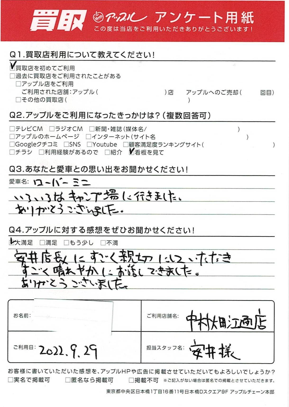お車のご相談・ 査定だけでもOK! カンタン 入力 30秒 アップルがブランド買取始めました! お電話でも受付中! 受付時間10:00 ~ 19:00 052-483-1181 お車のご相談・ 査定だけでもOK! カンタン 入力 30秒 アップルがブランド買取始めました! お電話でも受付中! 受付時間10:00 ~ 19:00 052-483-1181 アップルがブランド買取始めました! お電話でも受付中! 受付時間10:00 ~ 19:00 052-483-1181 店舗情報 在庫車 スタッフ紹介 ブログ お客様の声 キャンペーン 無料査定 click お客様の声 ご記入日: 2022/09/29 名古屋市 N様(男性)様 車名:ローバー ミニ 安井店長にすごく親切にしていただきすごく晴れやかにお話できました。ありがとうございました。 前へ 次へ お客様の声一覧を見る