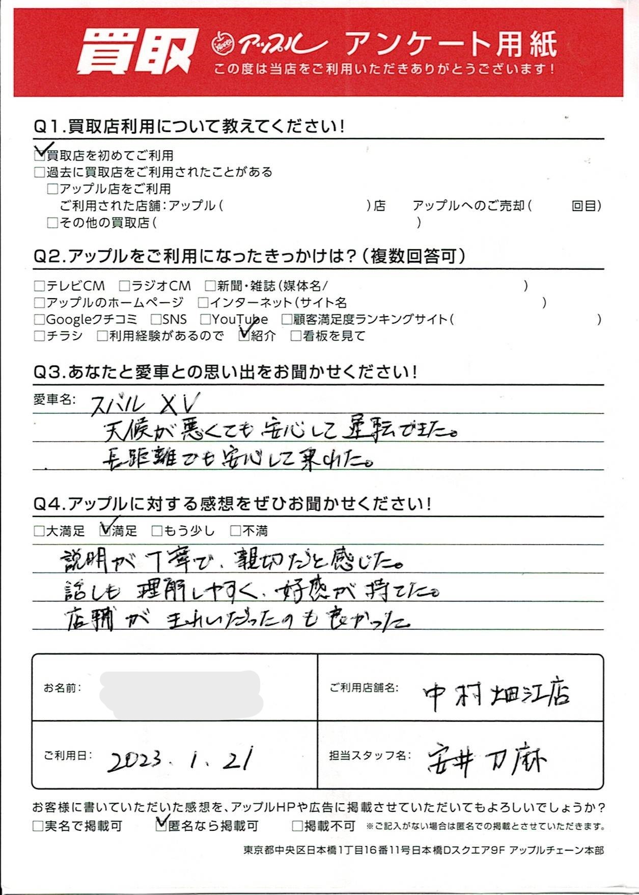 お車のご相談・ 査定だけでもOK! カンタン 入力 30秒 アップルがブランド買取始めました! お電話でも受付中! 受付時間10:00 ~ 19:00 052-483-1181 お車のご相談・ 査定だけでもOK! カンタン 入力 30秒 アップルがブランド買取始めました! お電話でも受付中! 受付時間10:00 ~ 19:00 052-483-1181 アップルがブランド買取始めました! お電話でも受付中! 受付時間10:00 ~ 19:00 052-483-1181 店舗情報 在庫車 スタッフ紹介 ブログ お客様の声 キャンペーン 無料査定 click お客様の声 ご記入日: 2023/01/21 名古屋市 T様(男性)様 車名:スバル インプレッサXV (~2017年5月) 説明が丁寧で親切だと感じた。話しも理解しやすく好感が持てた。店舗がきれいだったのも良かった。 前へ 次へ お客様の声一覧を見る
