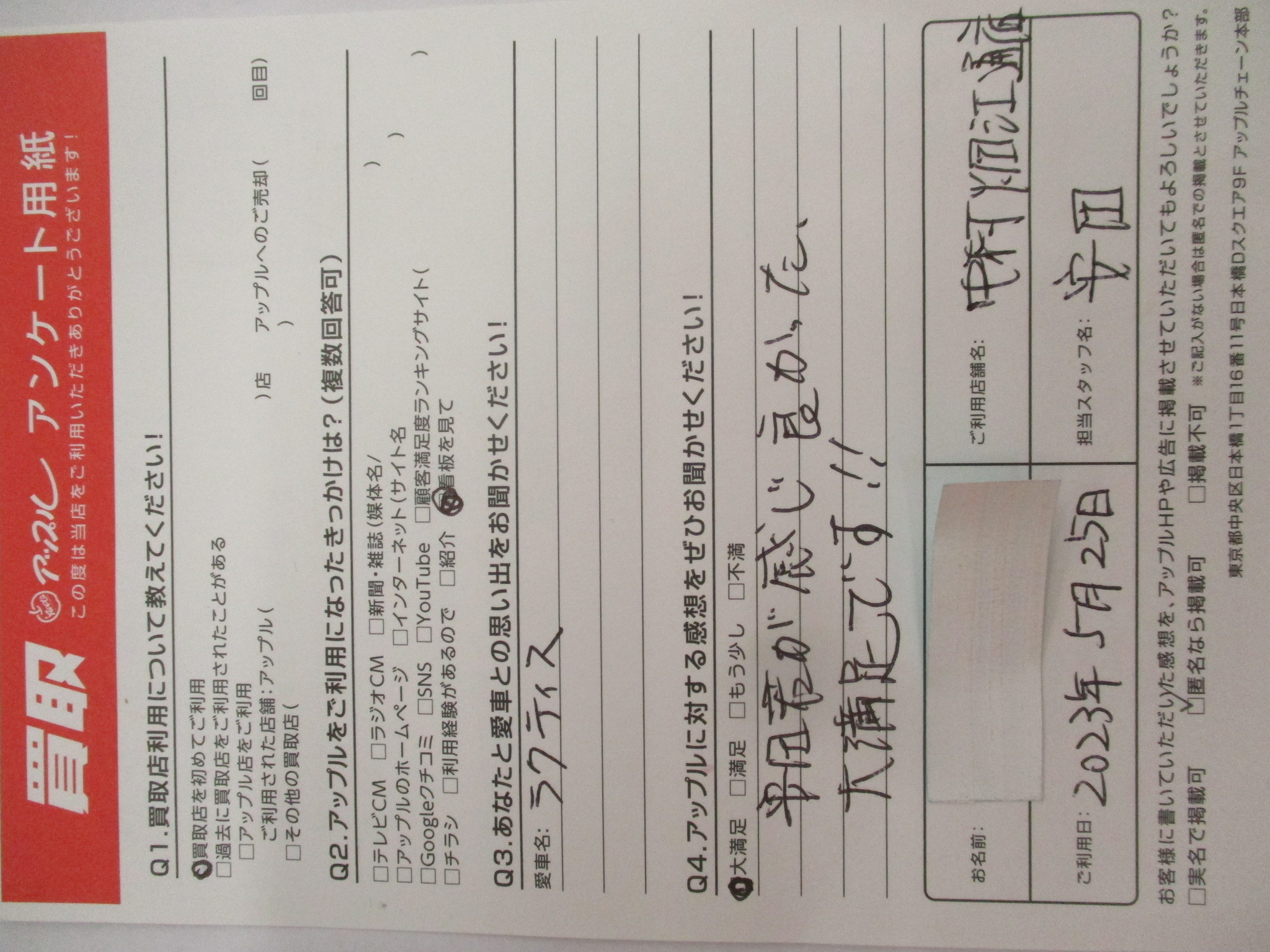 お車のご相談・ 査定だけでもOK! カンタン 入力 30秒 アップルがブランド買取始めました! お電話でも受付中! 受付時間10:00 ~ 19:00 052-483-1181 お車のご相談・ 査定だけでもOK! カンタン 入力 30秒 アップルがブランド買取始めました! お電話でも受付中! 受付時間10:00 ~ 19:00 052-483-1181 アップルがブランド買取始めました! お電話でも受付中! 受付時間10:00 ~ 19:00 052-483-1181 店舗情報 在庫車 スタッフ紹介 ブログ お客様の声 キャンペーン 無料査定 click お客様の声 ご記入日: 2023/05/25 名古屋市 I(男性)様 車名:トヨタ ラクティス 安田君が感じが良かった。大満足です!! 前へ 次へ お客様の声一覧を見る