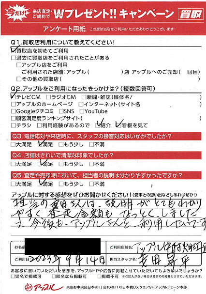 お車のご相談・ 査定だけでもOK! カンタン 入力 30秒 アップルがブランド買取始めました! お電話でも受付中! 受付時間10:00 ~ 19:00 052-483-1181 お車のご相談・ 査定だけでもOK! カンタン 入力 30秒 アップルがブランド買取始めました! お電話でも受付中! 受付時間10:00 ~ 19:00 052-483-1181 アップルがブランド買取始めました! お電話でも受付中! 受付時間10:00 ~ 19:00 052-483-1181 店舗情報 在庫車 スタッフ紹介 ブログ お客様の声 キャンペーン 無料査定 click お客様の声 ご記入日: 2023/09/14 名古屋市 I様 車名:メルセデス・ベンツ Eクラス(93年9月~) 担当の安田さんは、説明がとても分かりやすく査定金額もなっとくしました。又、今後もアップルさんを利用したいです。 前へ 次へ お客様の声一覧を見る